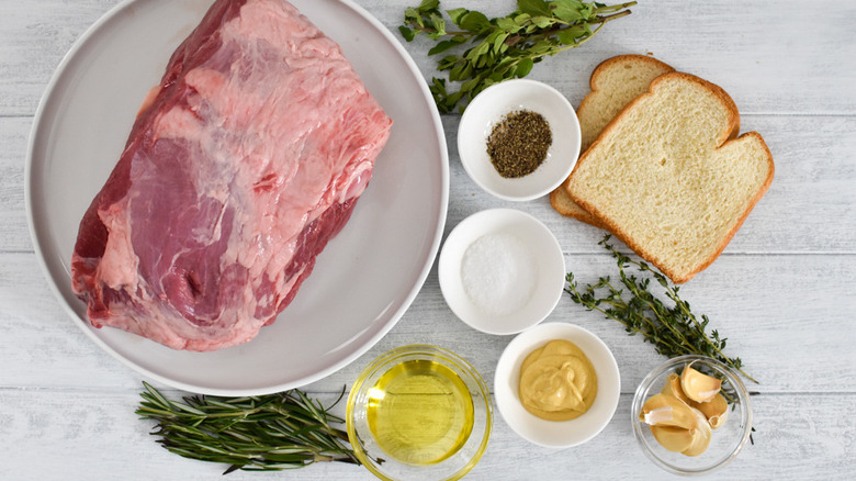First and foremost, to make a roast large enough for about 10 servings, you'll need a boneless leg of lamb that weighs about four pounds. Then gather a couple of slices of sandwich bread, plenty of olive oil, several sprigs of fresh rosemary, fresh thyme, fresh oregano, about a half dozen garlic cloves, sea salt, fresh ground black pepper, and some Dijon mustard. A quick note about the lamb itself from Rapone: "Look for a leg of lamb that is already boneless. If you can't get a boneless piece, and you're not comfortable with deboning, then ask the butcher to do this process for you."
