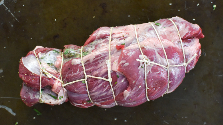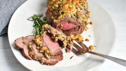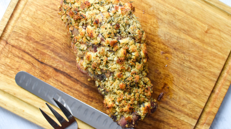 If you go step-by-step, closely following the directions laid out here by chef and recipe developer Stephanie Rapone, you'll be able to handle things. Make sure you trim the fat and hammer the lamb evenly, make sure you apply herbs, oil, and bread pieces lavishly, and keep a close watch on the meat as it cooks. And, when you slice into that perfectly tender, rich, and savory roast after nearly two hours in the kitchen, you'll be glad you put in the work. Looking to fill out the meal? Rapone says that "this would be delicious with some baby potatoes that have been roasted with salt, olive oil, and fresh rosemary."