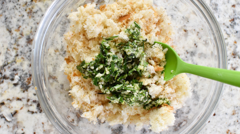 - Add the remaining herb mixture to the breadcrumbs, then add another 3 tablespoons of olive oil and stir to combine.