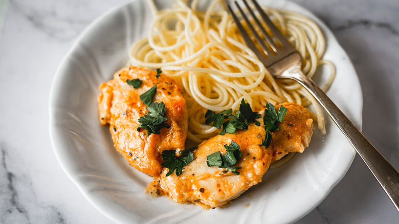 Serve one-skillet creamy chicken lazone sprinkled with parsley and optional spaghetti.