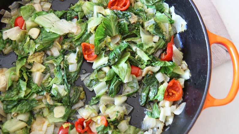 - Add the chopped escarole, lemon juice, chopped cherry peppers, 1 of teaspoon salt, and 1 teaspoon of pepper to the pan. Mix, and cook for 2 minutes. Top with the crispy prosciutto.