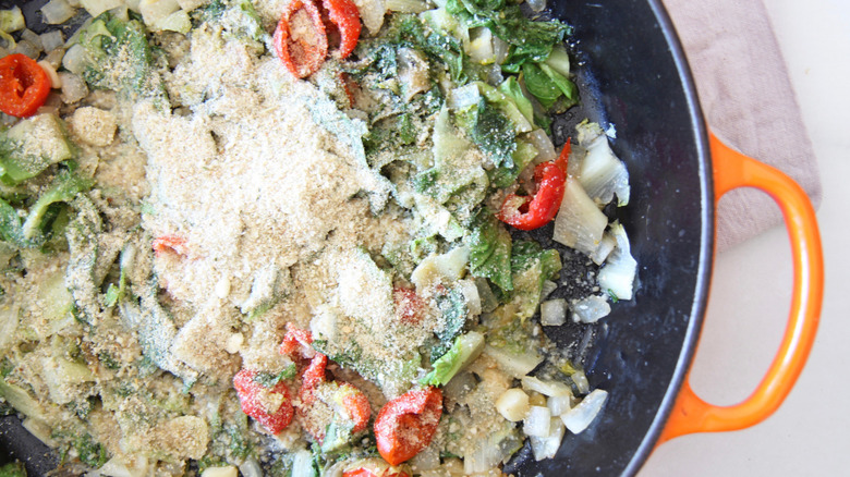 Take out a bowl, and toss in the breadcrumbs and the Romano cheese. Then, pour the breadcrumbs on top of the escarole mixture. Place the pan in the oven, and put it on broil. Then, set your timer for about a minute, and take the mix out when it begins to brown.