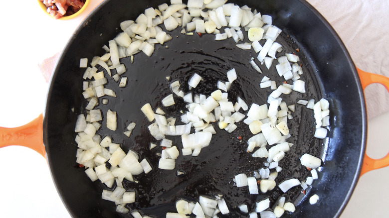 Add the garlic cloves, and the onion to the pan first. Next, sprinkle the salt and pepper over top. Let the onions cook until they turn translucent, as that indicates they're finished. (This should take about two minutes.) Now, there are only a few more things to do, and then the dish will be ready to eat. We told you it was easy!