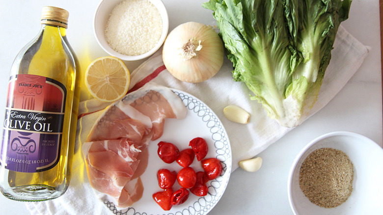 Let's dig right in and gather the ingredients needed to prepare this delicious dish. To start, you will need prosciutto, which is one of the tastiest meats out there, in our humble opinion. As we mentioned, if you're a vegetarian, you can omit and sub for peanuts if you'd like. "To get a salty crunchy bite, maybe add some crushed peanuts — about a handful," Goldstein suggests. Add olive oil and a few cloves of garlic to your shopping list in addition to onion, salt, and pepper.