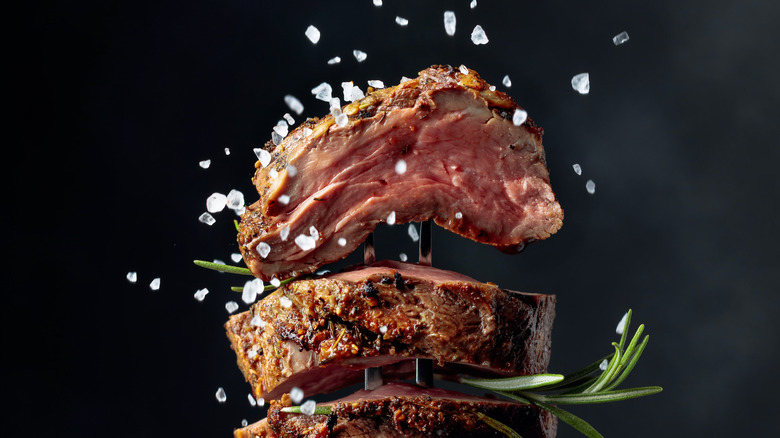 According to Kitchn, you should use one teaspoon of salt per pound of steak to really season it well from the outside. For those who prefer to eyeball it, Bon Appétit suggests using enough to coat the steak well without allowing multiple layers of salt to build up on the meat. Keep in mind, however, that this is just to season the outside of the steak. For many, the inside of the steak will also need a little bit of seasoning. But you should know that not all kinds of salt are created equally. That's why it is important to know which type of salt to use on a particular part of the steak.