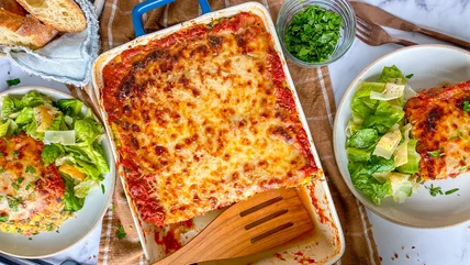 "I love to serve this dish with a classic Caesar salad and some garlic bread to help soak up the extra delicious sauce," MacLean suggests for side options. "It would also pair nicely with a glass of your favorite white wine." Also, if you have leftovers, she notes that you can store them in the fridge for up to five days, or frozen for up to three months. We hope you enjoy this cheesy, savory, delightful spin on traditional lasagna!