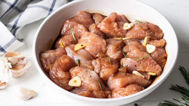 When it comes to marinating meat, you might have assumed that the longer it sits in the liquid, the better. Whether you're tenderizing tougher cuts of beef or seasoning some bland chicken breasts, marinating does wonders when it comes to taking the flavors and textures of your food to the next level, like with a garlic and red wine mixture, for instance. But that doesn't mean that the more you let it sit in the marinade, the better it'll taste when you cook it. Indeed, we have to admit that this is a bit of a rookie mistake.