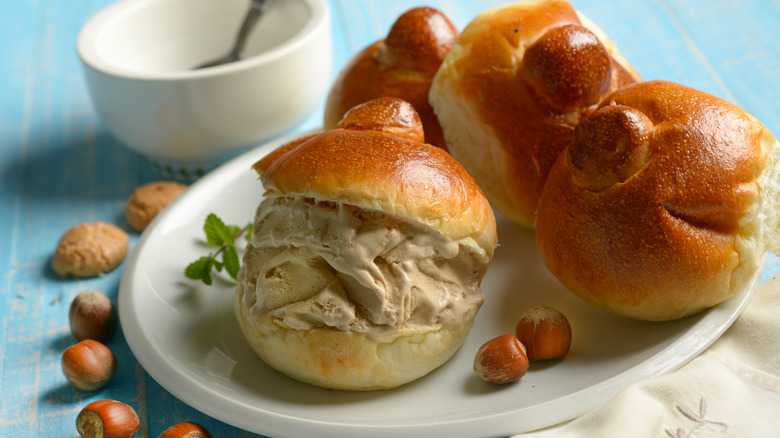 Serious Eats explains that it takes a special brioche to make a brioche con gelato. The bread is baked in the shape of a roll that looks and feels more like a burger bun, so it is able to hold its ice cream filling with little trouble. Some restaurants that serve this treat even have a special press that allows you to blitz the brioche for a few seconds with a bit of heat, so the bread is sealed, encasing the ice cream with warm bread, in all its frozen glory.