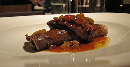 During a recent meal, a soba (buckwheat) crêpe ($19.50) enveloped duck and wild mushrooms, the lot dressed with a rich verjus reduction and golden raisins and topped with a slab of seared foie gras.