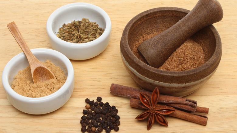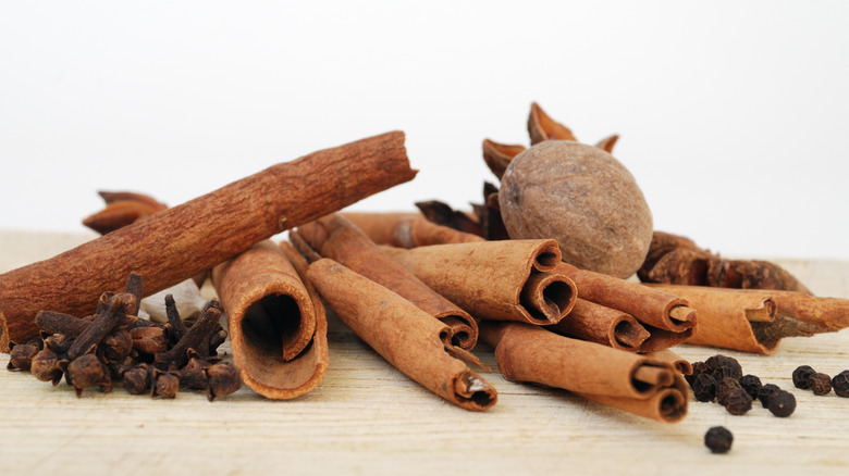 Alternatively, you could scrap the expected spice blend and go for one that's a bit more surprising. One recommended pumpkin pie purée hack is to try replacing it with Chinese five-spice powder. Made from equal parts cinnamon, cloves, fennel seeds, star anise, and peppercorns (white or Sichuan), Chinese five-spice powder is close enough to blend seamlessly with pumpkin but just unique enough to stand out and even add a savory note. In particular, the addition of peppercorns will delight and befuddle anyone who tries your pumpkin treats.