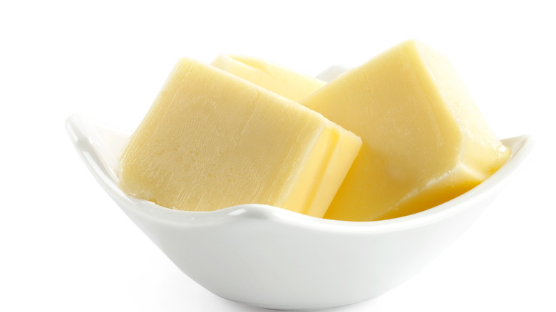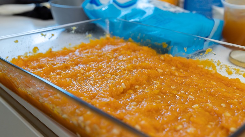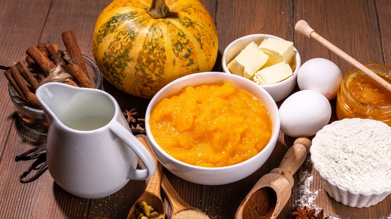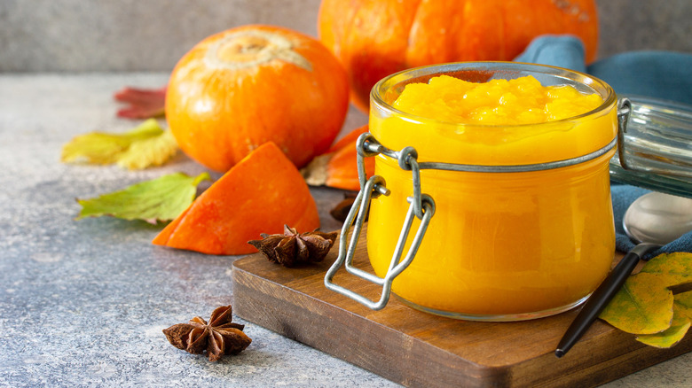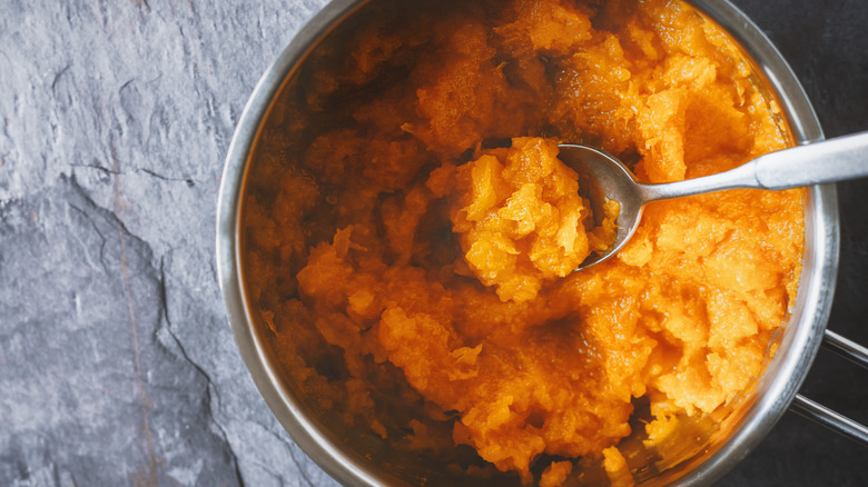 Regardless of whether you're preparing a sweet or savory pumpkin dish, butter adds creaminess and smoothness to the vegetable mash, elevating its flavor and overall mouthfeel. Butter's high-fat content is also ideal when preparing pumpkin soups, sauces, and fillings as it gives liquidy dishes more heft and body. If you're not a fan of butter (or are following a plant-based diet), consider combining canned pumpkin with coconut oil instead. Unrefined coconut oil will lend a tropical flavor to your pumpkin preparations, while the unrefined version has a completely neutral flavor. Aside from its flavor contributions, coconut oil gives canned pumpkin a creamier texture.