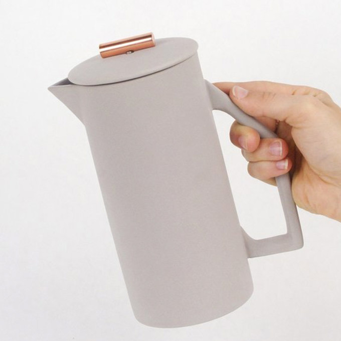 Bid adieu to broken glass French presses. Thanks to a sleek, thick-walled ceramic body, this sturdy version is clumsy roommate proof and keeps coffee nice and warm. Plus, the luxe look (granite-hued matte finish and copper pull) and oversize pour make caffeinating a crowd impressive and easy.