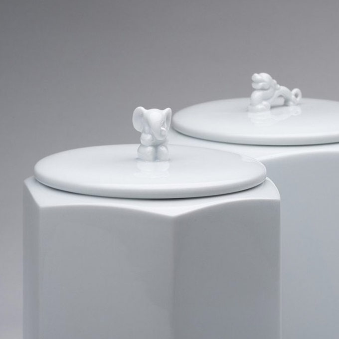Everyone needs a miniature dragon or elephant to keep one's Christmas cookies safe and sound. The small porcelain animals add subtle flair (and useful handles) to these versatile storage jars.