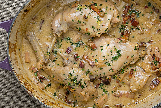 Braised Rabbit with Creme Fraiche, Bacon and Quince