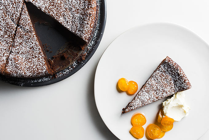 Chocolate and Chestnut Cake with Kumquat Sauce
