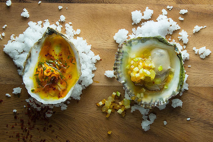 We're well into the r months now, so get shucking. Instead of a traditional mignonette, mix together chopped apple and preserved lemon for a unique raw bar topping.
