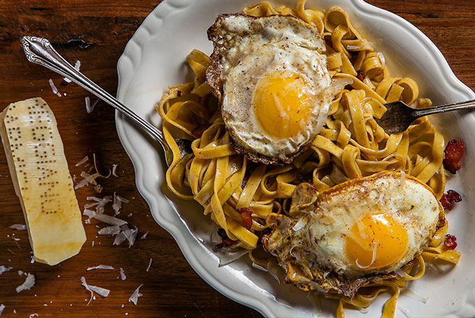Is it breakfast? Is it dinner? When you wake up at 4 p.m. with a pounding headache, labels just don't even matter anymore, especially when it comes to this fried egg-topped fettuccine.