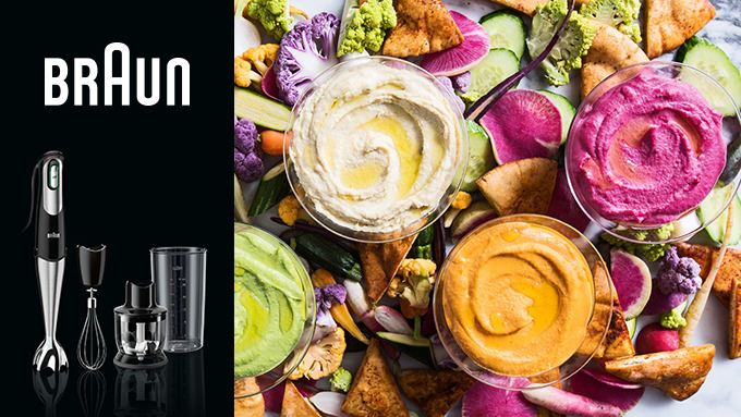 Sure, your Braun Multiquick 7 Hand Blender can chop to it for salsa, but it can do way more than that—like blend chickpeas with tahini, olive oil and colorful vegetable purées for a rainbow of a hummus platter.