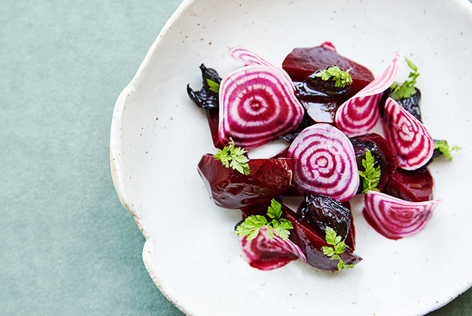 It's all about texture and pattern in this sweet–and–savory salad. Gleaming baby beets are beautifully set off by the dual–hued Chioggias.