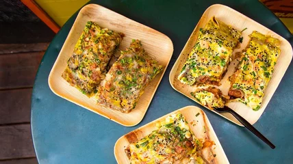 This Beijing-style street food purveyor serves the eponymous crepe that's popularly used to create sandwiches. The crepe starts with a mung bean, rice and wheat flour batter, which is then coated with scrambled egg, sesame seeds, scallions, hoisin sauce, crispy chile paste and cilantro. Fillings vary, with everything from Peking duck to vegetarian options, but the drunken chicken is a standout choice.