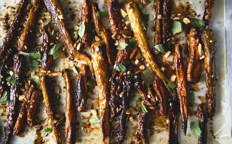 Get the recipe for this easy roasted carrot vegetable side dish, with homemade chili oil, spicy apricot jam, mint and almonds.