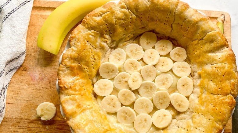 - Pour a thin layer of the chilled custard in the prepared pie crust. Thinly slice one banana and place the slices over the custard. Pour the remaining custard over the banana slices.