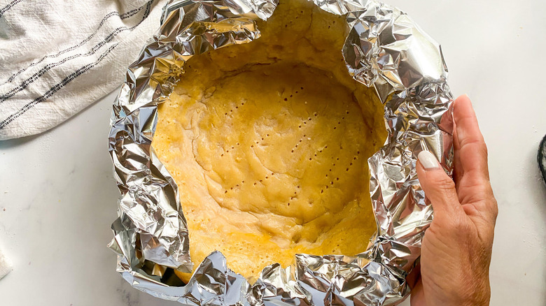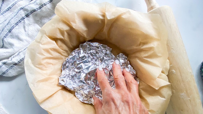 Next, take the dough out of the food processor and form it into a ball, then wrap that in plastic wrap and put it in the fridge for 30 minutes. Once it's thoroughly chilled, flour a large board and roll out the dough big enough to fit into your pie pan and place it in. Poke the pie crust several times with a fork — "this helps it release steam while it is cooking," Hahn explains. Then cut a round piece of parchment paper to fit in the pie tin and up its sides. Fill the concavity of the paper with some foil and press down into the center. This will hold the crust down so it doesn't puff out during cooking.