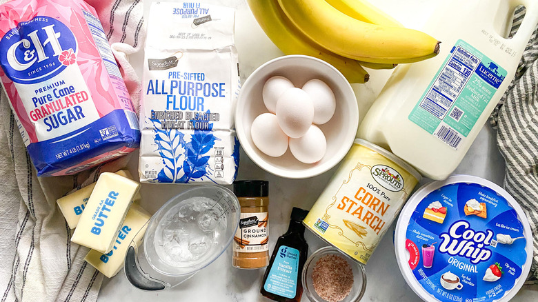 It takes a decent number of ingredients to make this pie, but all of them are easy to find. You'll need all-purpose flour, a good amount of sugar, some salt, a decent portion of unsalted butter, some ice water, eggs, cornstarch, milk, vanilla extract, whipped cream or whipped topping, and some ground cinnamon (both for use in the pie and more for topping it). Oh, and bananas.