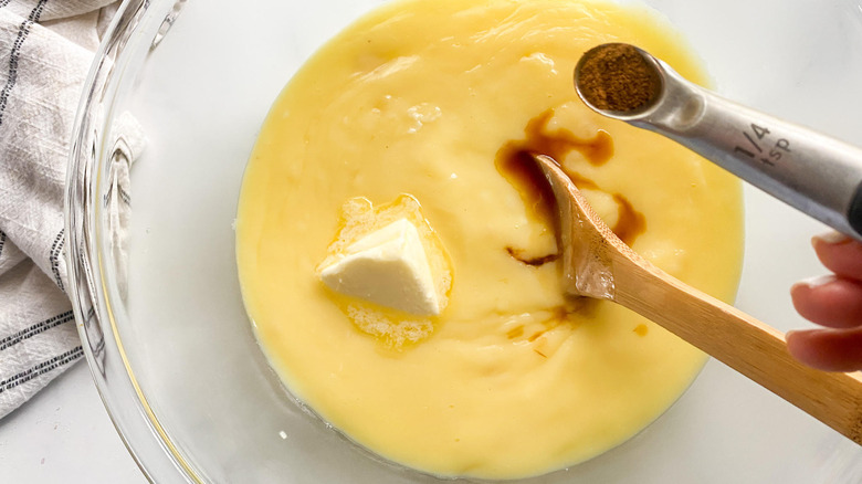- Transfer the custard mixture to a bowl and add the vanilla, cinnamon, and the rest of the butter. Stir until the butter is melted.