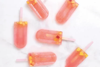 Get the recipe for home frosé-lemonade popsicles, which calls for summery rosé, fresh lemon juice, diced peach and more.