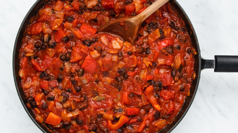 - Add the chopped tomatoes and black beans, stir, and leave to simmer for 10 minutes.