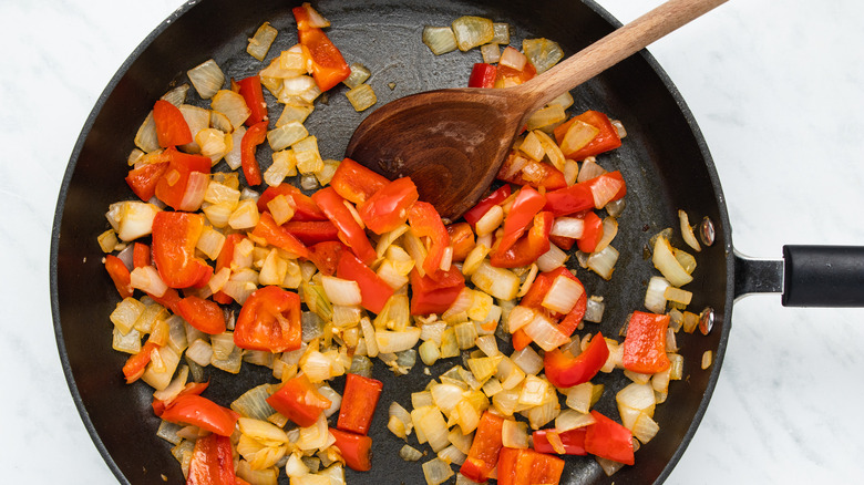 - Heat the olive oil in a large, high-sided saucepan and add the onion and red pepper. Fry over a medium heat for 6-8 minutes until the veggies have softened, then add the garlic and cook for another minute.