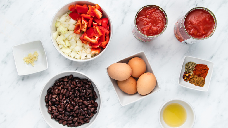 To make a pan of huevos rancheros, you'll need olive oil, diced onion, diced red bell pepper, crushed cloves of garlic, cumin, smoked paprika, oregano, red pepper flakes, salt and pepper a can of black beans (drained), 2 cans of chopped tomatoes (not drained), and of course some eggs. And some freshly chopped cilantro for serving is a good idea, too!