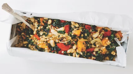 - To a large bowl, add the barley, roasted vegetables, beans, kale or chard, vinegar, olive oil, and tamari or soy sauce. Toss well to combine. Taste and season with additional salt, if desired.