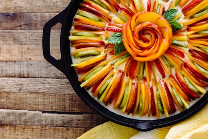 - Spread the custard cream evenly over the cooled graham cracker crust. Decide on which order you want to layer your fruit, then begin placing the fruit slices in a repeating pattern around the edge of the skillet, packing them in snugly. Once the outer circle is complete, start a second row closer to the center of the pan without overlapping. Once that row is complete, there will still be some space in the middle. You can fill it with another small row of fruit slices, or you can make a fruit rose (see note).