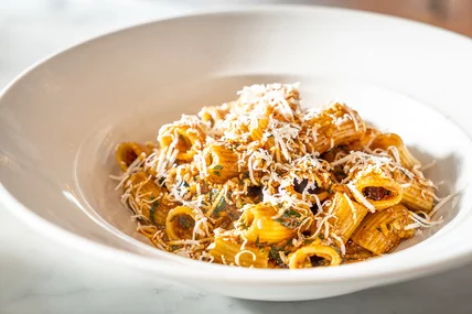 If you've been to NYC restaurant Santina, chances are you recall its refreshing Italian cuisine and abundant bright colors. But native New Yorker Ashley Eddie just took over as the executive chef, and you owe yourself a return trip to see how she's shaking things up for fall—like with this take on pumpkin pasta. "Instead of the obvious route of using actual pumpkin, I decided to use pumpkin seeds and oil which both pack a ton of flavor," she says. She then tosses the pesto with gluten-free rigatoni (the entire menu at Santina is free of gluten without hitting you over the head with it; feel free to use your pasta of choice here) and balances it with ricotta salata as the final touch.