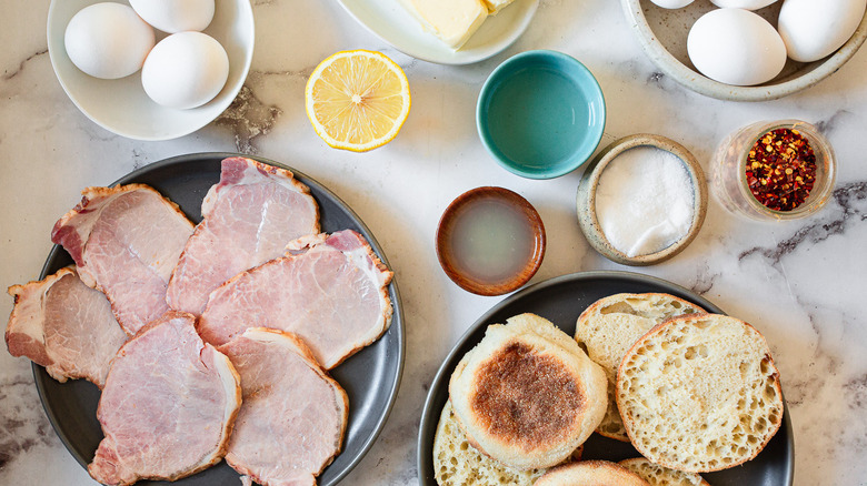 The rest of the ingredients are easy enough to find in any supermarket. You will need unsalted butter, English muffins, vinegar (for poaching the eggs), eggs, lemon juice, salt, and, if you're looking for just a hint of kick, cayenne pepper.