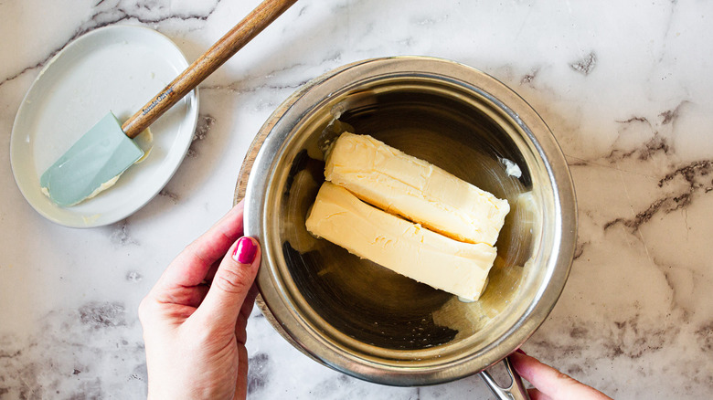 - Make the clarified butter: Heat a small saucepan filled with 1 inch of water over medium heat until steaming. Place a medium heatproof bowl over the steaming water. Place the butter in the bowl and let it melt completely. Let it sit until the butter has separated and the milk solids have sunk to the bottom of the bowl, about 10 minutes.