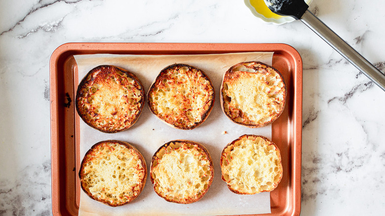 - Preheat the oven to 450 F. Place the English muffins on a sheet pan, nooks and crannies facing up, and brush each with the reserved milk solids. Bake until golden and crisp, 4 to 5 minutes. Keep warm.
