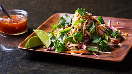A Southeast Asian staple, green papaya salad combines thin strands of unripe papaya with fresh herbs, dried shrimp and nuoc cham. L.A.-based chef Tin Vuong shares his recipe for the dish, in which he adds pieces of Chinese beef jerky for texture and rich flavor.
