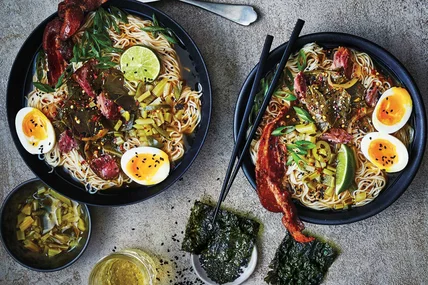 7. Cut the eggs in half and arrange on the bowls. Top with bacon, pickled collard green stems, scallions, sesame seeds and red pepper flakes, if using. Serve with lime wedges and nori chips.
