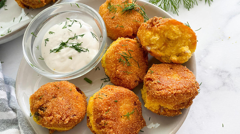 So, what might be a good occasion to whip up this crispy little treat? "Hush puppies are a fun appetizer to serve for a fun game-day spread or they are great for a child's birthday party or play date," Hahn suggests. "They come together quickly and the ingredients are mostly pantry and fridge staples." And, while this recipe does call for frying the hush puppies — that's how they earn the crispy title — Hahn does note that you could also air fry them, cutting back on the oil but maintaining that irresistible texture.