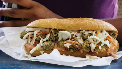 With an upbringing that involved countless road trips and moving from coast to coast a total of 13 times, you can bet actress Jazz Smollet and her family have picked up quite the collection of regional recipes over the years. And they're finally sharing it all in their new cookbook The Family Table: Recipes and Moments from a Nomadic Life, including this crispy oyster po'boy sandwich that's become a family staple.