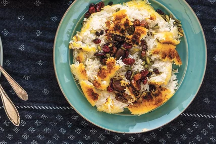 - Carefully unmold the rice onto a platter and serve. (Or, if it doesn't unmold easily, simply scoop the rice into a serving bowl with the crispy shards on top.) 10. Top the Persian Rice with the almonds, prunes, dried apricots, and dates and serve.
