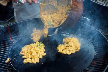 - When you're ready to eat, start your outdoor cooker, half with direct heat and half indirect. Divide the cooled mac and cheese into 8 balls. On the direct heat, melt the extra 2 tablespoons of butter in a skillet. Throw a couple of the mac and cheese balls into the pan and use your spatula to flatten them into pancakes.