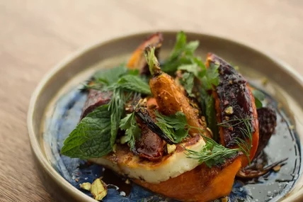 - Place the halloumi on a plate and evenly distribute the carrots on top. Drizzle with the pomegranate molasses and date molasses. Sprinkle the plates with the pistachios and scatter the herbs over the carrots and halloumi. Serve immediately.