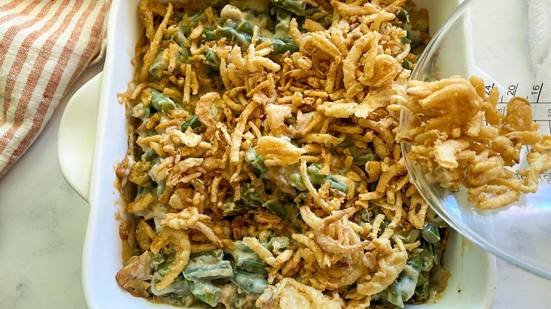 Green bean casserole couldn't be more "All-American" — it's a fixture on most Thanksgiving dinner tables, and it even makes regular appearances at Midwestern church potlucks and similar occasions. Recipe developer Miriam Hahn calls this dish "such an American traditional holiday recipe that it seems everyone has made it at some point or another" and says that while there are several different versions, the one in the recipe here is her favorite because it's "definitely the easiest to make." This is thanks in no small part to the fact that this recipe calls for convenient ingredients such as frozen beans and canned soup.