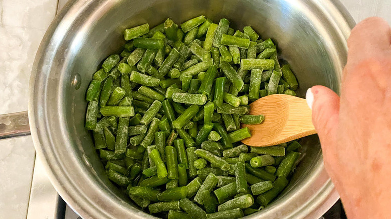 Cook the beans according to the package directions, but be careful not to overcook them. You want them still slightly crunchy because they will be cooked in the casserole, so you don't want them too soft before they go into the oven. The same holds true if you start with fresh green beans — you want the beans to have a little snap left in them before you cover them in soup and bake them.