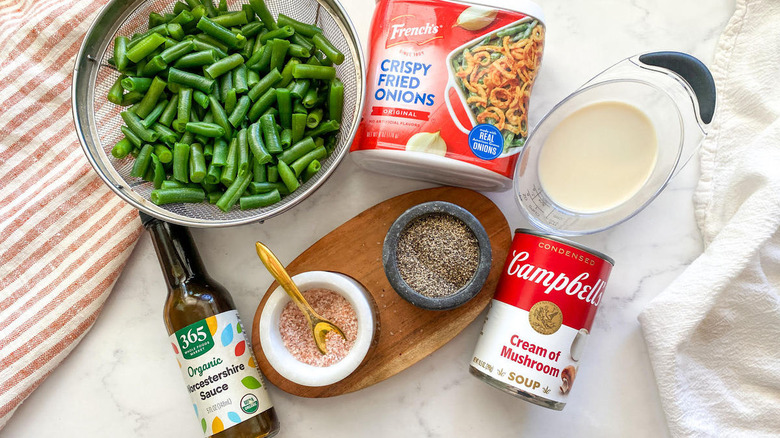 This casserole is made with frozen green beans, although Hahn says you can use fresh ones if you want. Ultimately, frozen green beans will give you the best results. The rest of the casserole is made up of canned mushroom soup concentrate plus milk, although again Hahn says you can substitute about 2 cups of homemade mushroom soup if you prefer. You'll need salt, pepper, and Worcestershire sauce for seasoning, and be sure not to forget the can of fried onions.