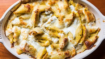 - Tear the burrata over the pasta, letting the curds and cream fall over and around the shells. Top with remaining Parmesan and bake until golden brown and bubbling, 30 minutes. Serve.